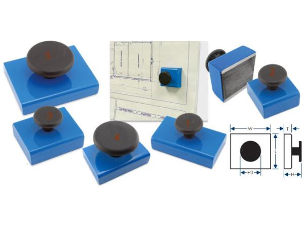 Rectangular Base Magnets with Knobs are painted with bright blue enamel, these heavy duty base magnets feature durable steel construction. Sturdy handles allow easy repositioning, or use as a retrieving magnet to pick up small tools and scattered nuts and bolts. Ideal for warehouse, workroom and office use.